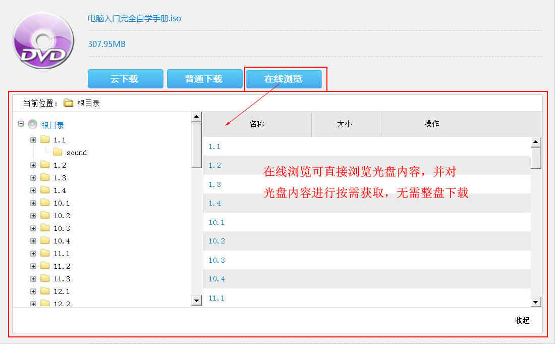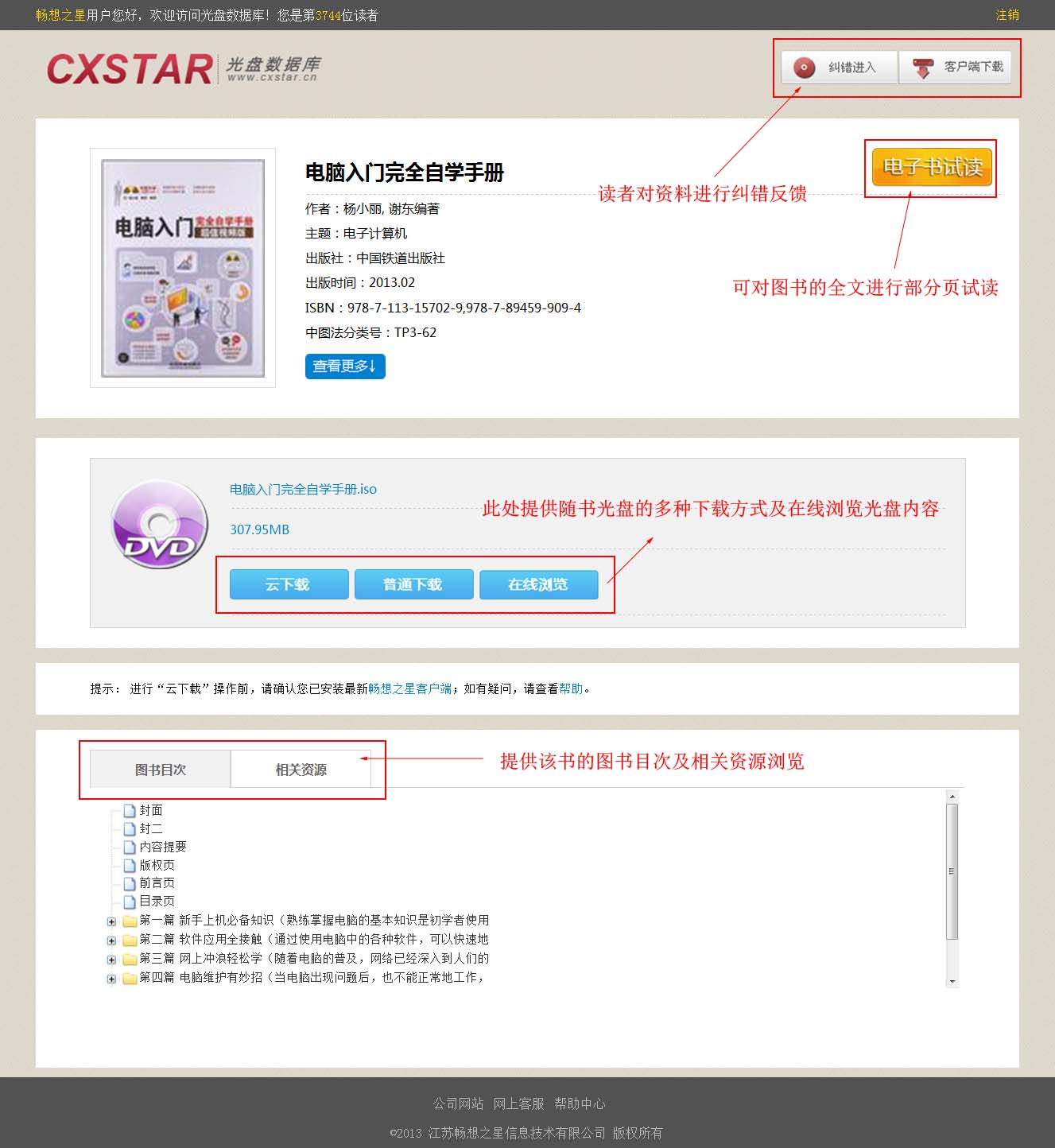 在线浏览:读者无需安装客户端,直接在线浏览光盘内容,并可对光盘内容进行按需下载。(如下面图6所示)