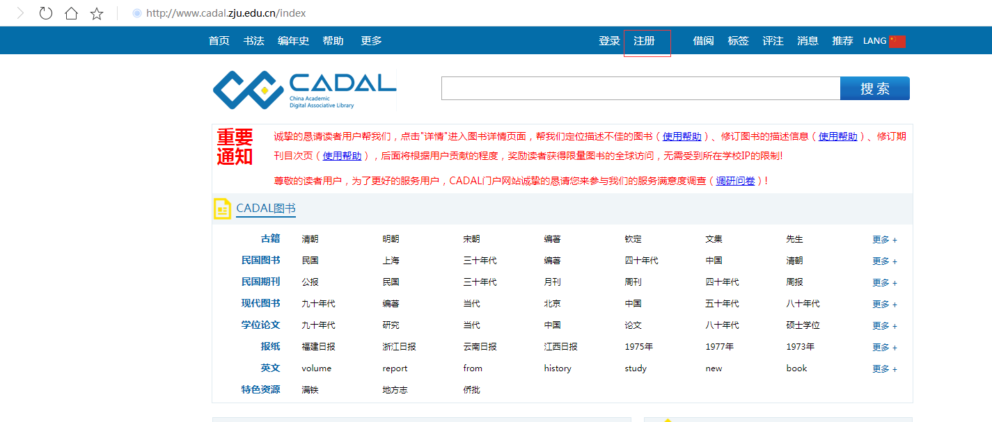 大学数字图书馆国际合作计划(China Academic Digital Associative Library,CADAL)前身为高等学校中英文图书数字化国际合作计划(China-America Digital Academic Library,CADAL)。国家计委、教育部、财政部在2002年9月下发的《关于“十五”期间加强“211工程”项目建设的若干意见》的文件中,将“中英文图书数字化国际合作计划(CADAL)” 列入“十五”期间“211工程”公共服务体系建设的重要组成部分。CADAL与“中国高等教育文献保障系统(CALIS)”一起,共同构成中国高等教育数字化图书馆的框架。